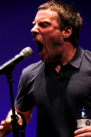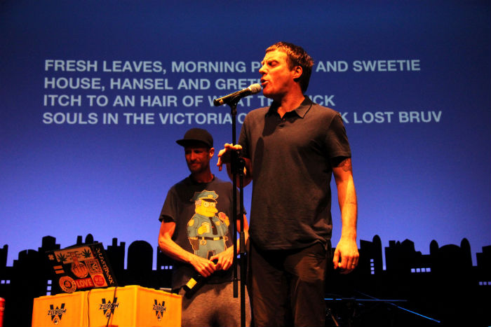 complementaria, que da como resultado una mezcla explosiva, corrosiva y arrojadiza. Originarios de Nottingham, y nuevos abanderados de la voz proletaria más rabiosa y combativa, combinan bases programadas por Fearn de post-punk, enlatado, angosto y puntiagudo, con el torrente letrista de Williamson en forma de rap abrupto, escupido y atropellado en su propia enajenación temperamental. En el escenario éste último se aferra al micro, grita versos de pocas rimas y mucha tralla, y empieza a segregar sudor y verdades a partes iguales, hasta quedar completamente empapado de su propio discurso. Mientras tanto, Fearn se dedica a darle al play a la base al principio de cada tema, y a observar impasible a su compañero el resto del mismo mientras bebe cerveza tranquilamente, se balancea ligeramente y saca fotos con su móvil al público.