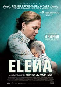 La película rusa Elena, de Andrei Zvyagintsev, premio especial del Jurado en el Festival de Cannes (sección «Una cierta mirada»). Dirigida por Andrei Zvyagintsev, protagonizada por Nadezhda Markina, Elena Lyadova, Aleksey Rozin y Andrey Smirnov y con música de Philip Glass. La protagonista de la cinta, Elena, una mujer de mediana edad muy humilde, casada con un hombre rico, al enterarse de que su marido no le dejará ninguna herencia ni a ella ni su hijo, un alcohólico desempleado, elabora un plan para ofrecerle a éste y a su familia una oportunidad. «Es un drama ruso austero ruso con matices de Hitchcock» (A.V.Club).