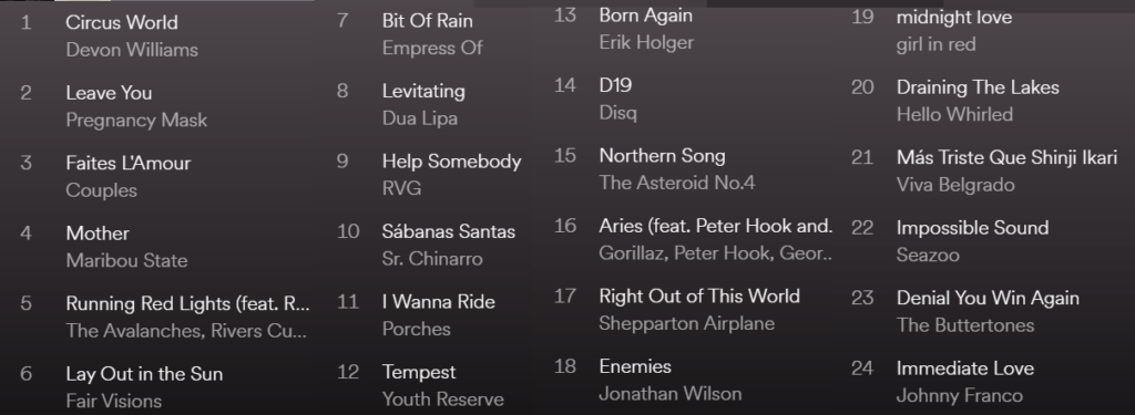 Además, los nuevos singles de Youth Reserve, Rolling Stones, Jónsi, Samyell, James Blake, Robi Mitch, Woodkid, John King Cave, 2nd Grade, Angelo de Augustine, Badly Drawn Boy, Belle Mare, Benjamin Biolay, Cat Seat Headrest, Timi Temple, The Daylight, Chuck Prophet, Sophia Boro, Trespasser Williams, Everything Everything, S.F. Johnson, Remo Drive, Rufus Wainwright, Rod Smooth, Jessie Ware, Katy J Pearson, Gary Olson, Jake Bugg, Fallon Cush, serpentwithfeet, Walt Disco o No Age, entre otros. Además, sonido nacional con Mujeres, Los Estanques, Melenas, Rusos Blancos, Terry vs Tori, Viva Belgrado, b1n0, Purila Sniper o Confeti de Odio, entre otros.
