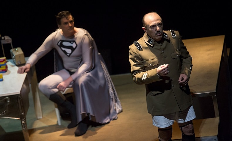 El escritor Francisco Casavella parecía definir en uno de sus precisos artículos, sin saberlo (o tal vez sí, capaz era), las diversas virtudes de esta Mitad del mundo cuando se refería a la sabiduría, el grado más alto del conocimiento, como «la reunión de un magnífico sentido del humor, siempre bajo la atenta vigilancia de una lucidez nada presuntuosa, pero capaz de asomar formidable en una situación, en una frase, en un giro de diálogo o en un párrafo». Ahí estamos. El plantel protagonista, encabezado por unos excepcionales Javier Márquez (auténtico Superman) y Miguel Guardiola (dictador sin piedad), incluye igualmente con acierto a la cantautora Ana Loig, flamenca y hiphopera —según su cuenta de Twitter— que otorga agradecidas treguas al combate verbal de Pinochet y Reeve introduciendo interjecciones y rescatando piezas significativas de Bach, Víctor Jara o Bob Dylan. El resultado es un artefacto metateatral que, con cierta querencia didáctica, conjuga en su desarrollo constantes soluciones escénicas y fructífera dialéctica sin perder de vista el humor, rasgo que con frecuencia —lo habrán oído y comprobado en alguna ocasión— denota inteligencia. Y de eso aquí hay una pila.