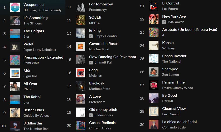 Además nuevos adelantos de Aoife Nessa Frances, Black Pumas, Blonde Redhead, Castle Teather, Deeper, Death Cub for Cutie, Def Rain, Drop Nineteens, Duck Lake, Eartheather, Elijah Johnston, English Teacher, Etta Marcus, Explosions in the Sky, Gregg Garvey, Ilgen-Nur, Jonathan Wilson, juicer, Katrina Weissman, Lost Girls, METTE, The Mirrors, Muunjuun, Nation of Language, Peter Gabriel, Piper Cole, Sea Glass, Squirrel Flower, Sufjan Stevens, Teenage Fanclub, The National, TV People, underscores, url,Vanishing Twin, Void Comp, Whitney, Wild Nothing, W.H.Lung, Winten o Zoe Lemon. Y sonido nacional con Adios Amores, Comando Suzie, J, Luz Futuro o Tulsa.
