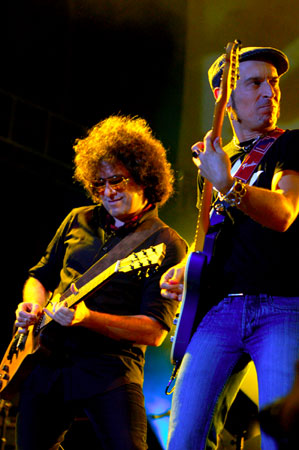 Después de la presentación, siguió el concierto con Hacer el tonto. Pero fue a continuación, con Loco y Corte de Huracán, unidas en una sola canción, cuando todo el público cantó al unísono. Más tarde vinieron otras dos de El salmón: Lo que no existe más y Días distintos. Y Corazón en venta, de su flojo último disco El palacio de las flores, fue el momento elegido para saludar al sector argentino, a sus compatriotas del Río de la plata. La lenta Crímenes perfectos y la roquera Alta suciedad continuaron la fiesta, y si con Horarios esclavos volvió a retomar El salmón, con Canal 69 hizo que recordáramos a Los Rodríguez, momento en que se despidió fugazmente, ya que regresó para interpretar Paloma, que cerró esta primera parte del concierto a cargo de Andrés Calamaro. Llegados a este punto y tras una pequeña pausa de no más de cinco minutos, vimos cómo Fito y Calamaro unían sus fuerzas de nuevo. Andrés hizo un amago e interpretó un pequeño trozo del tango Los mareados que fusionó con Estadio Azteca, momento en el que se le unió Fito. Terminada la canción, Calamaro dio el relevo a su compañero, que después de otra pequeña pausa comenzó su repertorio.
