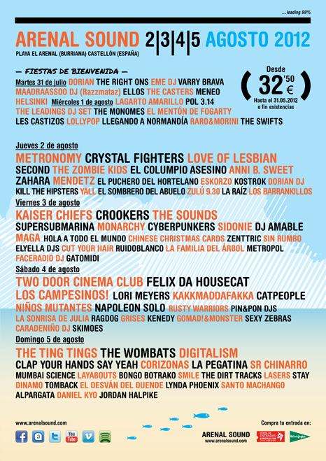 Arenal Sound, que tendrá lugar del 2 al 5 de agosto en la playa El Arenal de Burriana, es una de las citas musicales del verano más esperadas, donde los “sounders” podrán disfrutar de 4 días de festival, 2 fiestas de bienvenida, más de 100 artistas, 6 días de acampada a pie de playa, fiestas en barco, piscina, etc…Pero esto no es todo, a los cuatro días de festival hay que añadirle 2 Fiestas de Bienvenida que se celebrarán los días 31 de julio y 1 de agosto en el recinto del Beach Club y a las que podrán acceder gratuitamente todas las personas que tengan una entrada de Arenal Sound 2012, sea del tipo que sea.