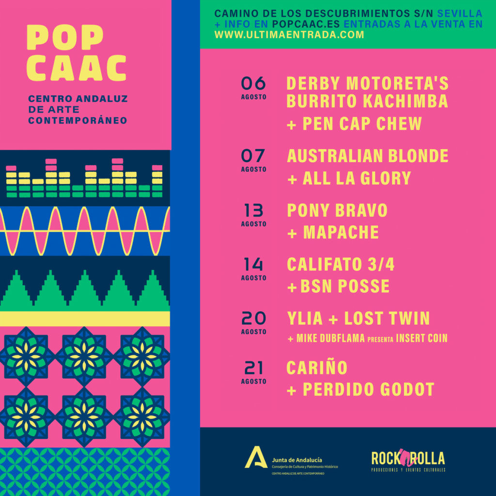 La programación de este mes de agosto incluye artistas como Derby Motoreta’s Burrito Kachimba, que repiten por tercer año consecutivo y llegan con nuevo single bajo el brazo, el potentísimo «El Valle»; una de las revelaciones de la temporada, Califato 3/4, acompañados para la ocasión por sus colegas de BSN Posse; los también sevillanos All La Glory y su fantástico «Disco Fantasma» junto a unos clásicos de los 90 como son Australian Blonde; el pop desenfadado del trío femenino Cariño dando la alternativa a los locales Perdido Godot; dos de los nombres más internacionales de la escena electrónica andaluza, Ylia y Lost Twin; el esperadísimo retorno de Pony Bravo, un regreso al que hay que sumar también los de los también sureños Pen Cap Chew y Mapache; y el espectáculo audiovisual con videojuegos clásicos «Insert Coin» que presenta Mike Dubflama. A tan increíble oferta de música en directo se suman los djs que amenizarán las veladas entre conciertos, con nombres como Chica Unicornio, La Rubia Pincha, Puto Yayo o Mendiguetto.