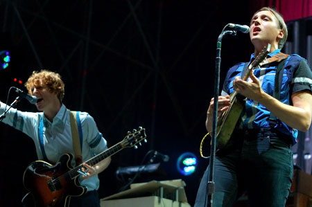 La banda del momento. Los canadienses Arcade Fire ofrecieron un gran concierto. Empezaron con Keep the car running, a la que siguió la festiva No cars go, ambas de su último disco Neon Bible (Rough Trade, 2007). Hay quien dice que las canciones de este nuevo álbum no entran tan bien en directo como las de su debut. Bobadas. Del disco Funeral (Merge, 2005) pudimos escuchar Haiti, a la que siguió Black mirror. Más tarde, una auténtica explosión de júbilo se produjo con Neighborhood #2 (Laika). Y es que la gente reunida no paró de cantar y saltar. Algo parecido ocurrió en la recta final del concierto con varios de los mejores temas de la banda: Neighborhood #3 (Power out), Rebelion (Lies) o Intervention, esta última una de las canciones que mejor suenan en su último disco. Pero la ganadora, por goleada, fue sin duda Wake up, convertida ya en un himno de sus conciertos. Podemos decir que fue el “singalong” del festival.