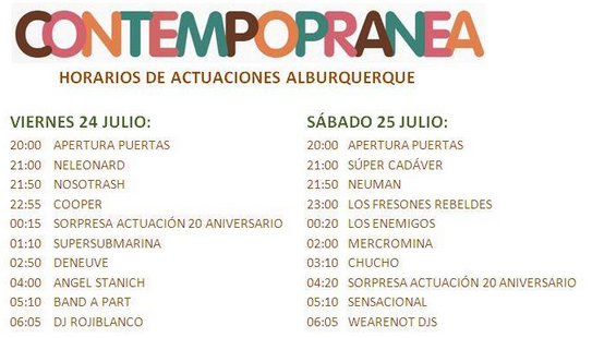 Contempopranea se permite el lujo de sorprender a sus seguidores con dos actuaciones sin anunciarlas previamente en el cartel, un hecho insólito en el panorama de festivales. De esta manera el festival ofrecerá a sus fieles todo un regalazo con dos bandas muy importantes, una de ellas es una reaparición muy especial, atentos a la jugada.
