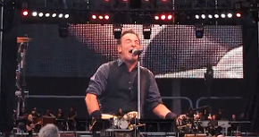 Una fecha significativa, 2013, que no hay que olvidar, ya que este año se cumplieron 30 años de la publicación de su primer trabajo. El músico interpretó buena parte de su repertorio más conocido- alguna de las canciones por petición popular, como Rosalita, que suele tocar poco en sus actuaciones en directo- durante más de tres horas, en las que se unió al calor del público del estadio El Molinón de Gijón, sacando a bailar a niños y chicas a lo largo de la noche. Fueron un total de 32 canciones las que interpretó, en su ya tercera visita a Gijón, repertorio que incluyó versiones como Travellin band de Credence Clearwater Revival. Una noche en la que no pudo olvidarse de la coyuntura actual: «Corren malos tiempos en América, en España y en Gijón. Esta canción se la dedicamos a la esperanza en tiempos mejores. Y a los pobres. Y a Proyecto Hombre». Abajo, la canción con la que abría el concierto y con la que se presentaba ante su público «¡Buenas noches, Gijón!»