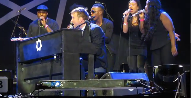 Luego salieron los Heavy seas choir, un coro de cinco voces de color y a quienes habíamos conocido en el hotel unas horas antes, donde también se alojaba Damon. Allí ensayaban algunas de las piezas que más tarde sonaron en el concierto. Esta segunda parte pareció incluso más del agrado del público allí presente, que aportaba un ritmo gospel y más fresco al repertorio: Mr. Tembo, Heavy seas of love o Three changes (de The Good, the Bad & the Queen). El momento más esperado- que habíamos anunciado por twitter en exclusiva unas horas antes gracias a nuestros espías- fue la interpretación de Damon al piano con las voces del coro de una de las emblemáticas de Blur, Tender. Aquí si que pidió al público que cantara; lo hizo a través de su bajista y en castellano » cantad como si estuvieráis locos». La interpretación fue sin duda el momento álgido y la actuación del músico una de las más emocionantes de las vividas en el festival el pasado fin de semana.