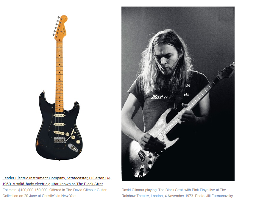 Había más de 120 guitarras en subasta, una de las cuales batió el récord mundial de guitarra más cara vendida en una subasta. El primer récord fue «Black Strat», la Fender Stratocaster de 1969 que Gilmour usó en todos los discos de Pink Floyd desde The Dark Side of the Moon hasta The Final Cut. Fue el último instrumento vendido en el día y por un total de 3.975 millones $, lo que, según Christie’s, es el precio más alto por el que se vendió una guitarra en una subasta.