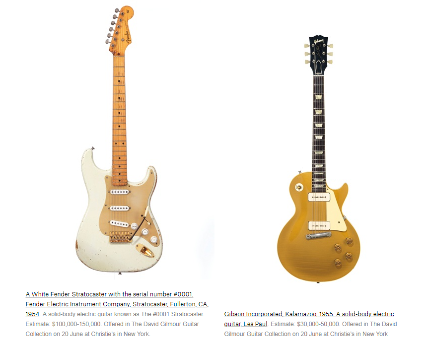 La subasta también estableció un nuevo récord por el precio de una Gibson Les Paul, con la que Gilmour tocó el solo de Another Brick in the Wall, Part 2. Se vendió por 447,000. Su Strat de 1984, que fue su guitarra habitual entre 1988 y 2005, recaudó 615,000 $ .