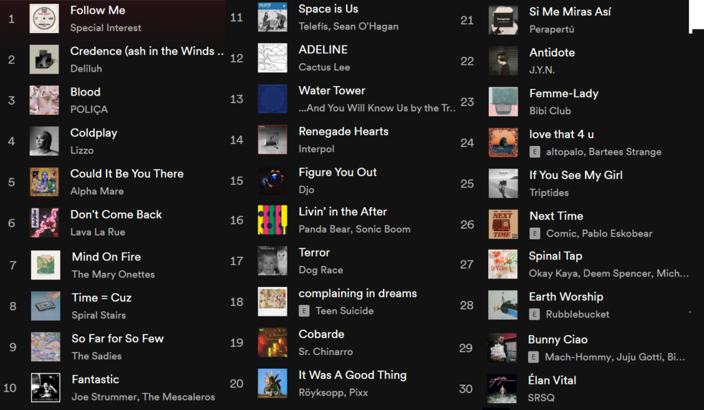 Además los nuevos singles de Aaberg, Aidan Noel, Air Waves, Alice Boman/Perfume Genius, ALIAS, Alicia Clara, Amtrac/Samuel T.Earring, Aves, Babehoven, The Backseat Lovers, Badge Epoque Ensemble, Beth Orton, Bleach Lab, Blondshell, Carla dal Forno, Cayucas, Chi Ching Ching, Cold Gawd, Comic/Pablo Eskobear, Community Swimming Pool, Cordio ft Las Migas, Coughing Doves, Dana Williams, Djo, Dougie Pool, Dr John/Aaron Neville, Drugdealer, Dust Cwaine, Dvrk Romantics, Ezra Collective, FaltyDLY ft Julianna Barwick, Fazerdaze, FIG, Goodmorning Pancake, Gently Tender, Greentea Peng, Greta Morgan, Imarhan, Indigo Sparks, iogi, Iron & Wine, i sosa, Jackson Watson, Joe Strummer, Joeboy, Jónsi, J.Y.N., Kainalu, Kolb, Lande Hekt, Lowertown, Melody Echo Chamber,Melby, Miya Folick, Muzzy Fossa, The National/Bon Iver, Nikki Lane, Nosaj Thing/Julianna Barwick, Ondara, Palm, The Paranoyds, Pearla, People Mover, PJ Harvey, Poster Paints, PVA, PWNT, repeat repeat, RIBBON STAGE, Rubblebucket, Serge Preo, Swansea Skag, Talk Show, THUS LOVE, Tim Burgess, Tegan & Sara y Whitney. Y sonido nacional con Centauros, La Paloma, Maria Jaume, Mediapunta, Perapertú, Pipiolas o TAURO.