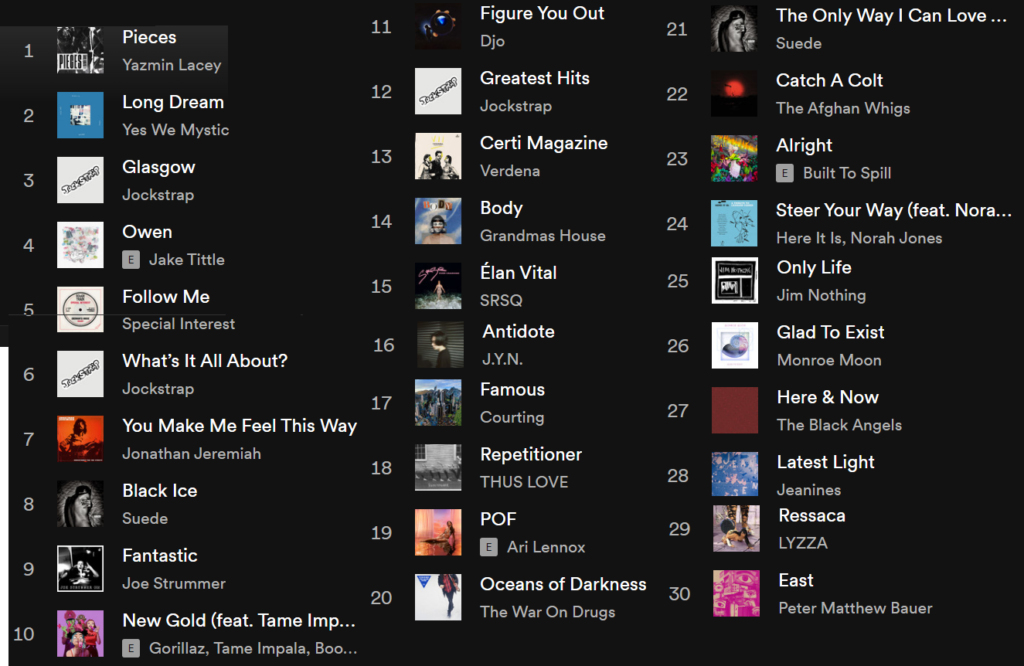 Además los nuevos singles de A.A. Williams, Absinthe Father, Alex Lilly, Alewya, Alvvays, Anna B Savage, Bill Callahan, Billy Idol, Björk, Black Market Karma, Black Sea Dahu, Bleach Lab, Blood Orange, Blue Mena, Bonny Doon, Broken Bells, Calexico, Cate Le Bon, Catholic School, clipping, The Clockworks, Colour TV, Crystal Box, CRUHDA, Daniel Avery, Dear Nora, Dehd, Depression Baby, Disq, DYLYN, easy life, Ezra Collective Fauness, FIG, Fleur bleu.e, Freddie Gibbs, Free Refills, Freja the Dragon, GArdening, Gift, Giveon, Gwenno, Hand Habits, The Hanged Man, Jeanines, Joesef, Julia Sabra, Kids, Meat Wave, Metz, Miss Gritt, MorMor, Mother Sun, The Murder Capital, Nick Hakim, New Obsessions, The No Ones, Oh Hell, Orchid Mantis, Phantom Youth, Plaid, Red Hot Chili Peppers, Ruby Haunt, R.Missing, Rodolphe Coster & Band, Rubblebucket, Sad Park, The Silver Lines, Slug, Sure Sure, Tenci, THUS LOVE, Velvete Negroni, Weyes Blood o The War on Drugs. Y sonido nacional con Amor Butano, Carolina Durante, Centauros/Algora, Ciutat, Confeti de Odio, Depresión Sonora, Fino Oyonarte, Marala, Núria Graham, Parquesvr, Second, Sidecars, Sr Chinarro, Vicente Navarro y Will Spector y los Fatus…