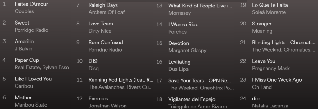 También los nuevos singles de Erik Holger, Bob Dylan, Happyness, East Harbor, Bright Eyes, Irena Zilic, Braids, Rooskin, Everything is Recorded, Jaunt, Annie Burnell, Ruby,Flat Worms, The WLDLFE, Runnner, Boy Azooga, Twen, Dad Sports, Talk Show, Saraya Summers, Squid, Naoise Roo, Nation of Language,Yves Tumor, Brendan Benson, ALDO, NZCA LINES, Seazoo, Sleep Radio, MOTO BANDIT, Jason Isbell, Gaspar Eden, Trace Mountains, Benjamin Gibbard, Stay Lunar, RVG, Muzz, Modern Leisure o el single debut en solitario de Gary Olson, fundador de The Ladybug Transistor. Además, sonido nacional con Melenas, Joe Crepúsculo, Rosalía, Nueva Vulcano, Vega Almohalla, Chucho, Confeti de Odio o Belako, entre otros.