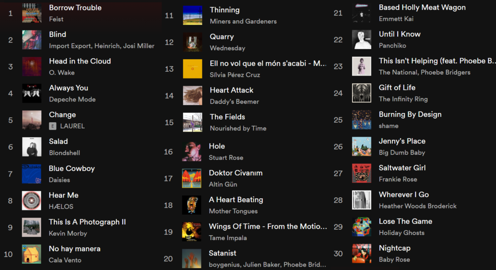 Y los nuevos singles de Acid Klaus, AJJ, Alex Hall,Alice Phoebe Lou, Amaarae, Angel Du$t, April March, Arlo Parks, bar italia, Beach Fossils, Bernice, Big Blood, Bloc Party, Califone, Chew Bear, Clark, The Clientele, Daisies, Deary, Ekkah, Florence+ the Machine, Foo Fighters, flowerkid, Four Tet, Geo Jordan, Girl and Girl, Hnry Flwr, Hollow Bodies, Jay Jay Johanson, Joseph Lotian, Kaminsky, Kevin Morby, King Krule, kwes./Sampha/Tirzah, Low Cut Connie, Modern Cosmology, Modern Woman, M.Ward, Neurotypes, Noel Gallagher´s High Flying Birds, Palehound, PJ Harvey, Protomartyr, Purr, Peter Gabriel, RVG, Samuel Organ, Sparks, Spearside, Sweet & Lonely, Swimm o Thundercat/Tame Impala, entre otros. Además sonido nacional con Alcalá Norte, Bronquio, Bueno Perdona, Chica Sobresalto, El Faro, Los Yolos, Mira Paula, El Ultimo Vecino, Júlia Colom, Sílvia Pérez Cruz, Cala Vento, La Culpa, LA MILAGROSA, Renaldo & Clara, Ruiseñora, Triángulo de Amor Bizarro, Florent & Yo, julia amor, La Trinidad, Surfin´Bichos o Sen Senra.