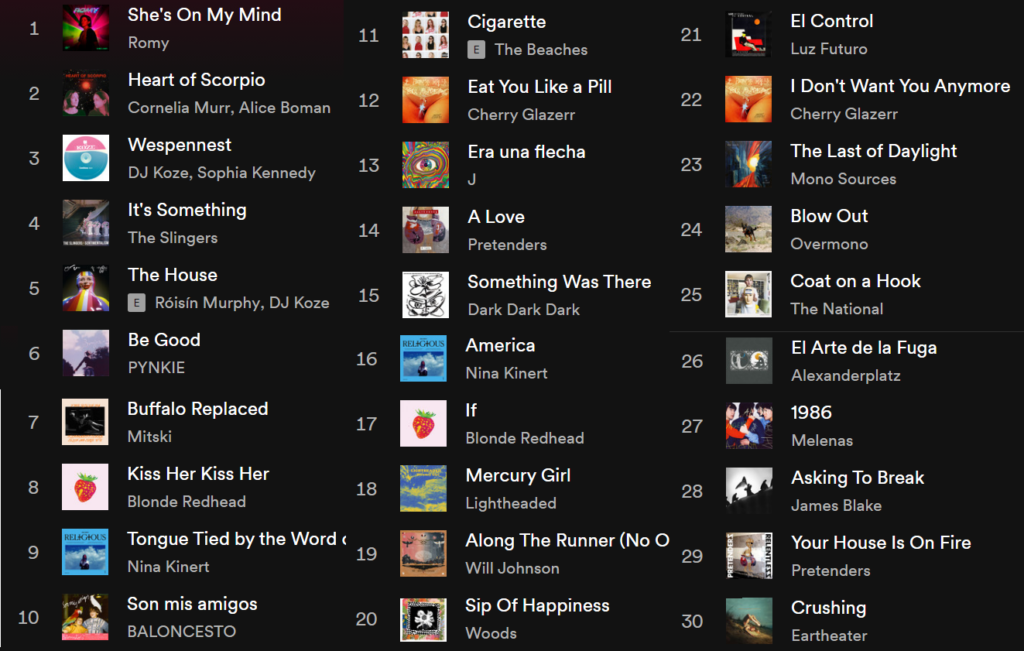 Y los nuevos singles o adelantos de about-faces, Amateur Hour, Anna Mose, bar italia, Beauty Queens, Bellboy, Bill Ryder-Jones, Bayonne, Betre, Cal in Red, Champione, Cory Hanson, Debby Friday, Diving Station, Drella, The Drums, Emily Simon, Empty Country, Empress of, French Cassettes, Goofy Geese, Hotline TNT, Jobs, La La, Lescot, New Dad, O., Pacer, Quincey May Brown, Return Fights,The Rolling Stones, Saint Roy, Sorcha Richardson, The Loveliness, Twin Rain, The Park o The Murder Capital, entre otros. Y sonido nacional con Alexanderplatz, Baloncesto, Escuelas pías, Eterna Joventut, interrogación amor, J, Mikel Erentxun, Laura Lebone, Melenas, Mujeres, Natalia Lacunza, The New Raemon, Nueve Desconocidos, Ripoll, Roldán, Sexy Zebras o Tigres y Leones.