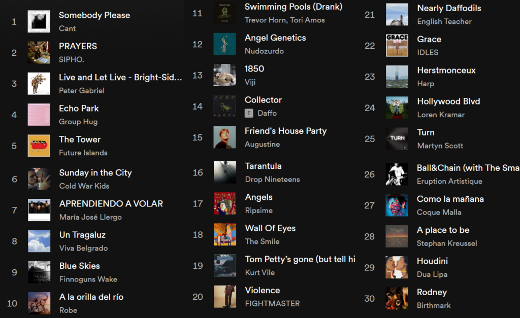 Además los nuevos singles de Adored, Adrianne Lenker, Alex Mcartor, ALIAS, alpha gal, Amanda Palmer, ammar, The Beatniks, Bill Ryder Jones, Birthmark, Born at midnite, Bright Eyes, Candid Faces, carpetgarden, Causeries, Channel Tres, Chelsea Reed, Cigarettes after Sex, Cozyfruits, Dance Yourself Clean, Daniel Noah Miller, Dark Room, Ducks LTD, Eels, Evening Elephants, Eruption Artistique, Everything Everything, 8485, The Feels, Fenne Lily, Fred Again…,Finnoguns Wake, Frankie, Furrows, Gabriel Auguste, gglum, Golf Trip, Hot Hot heat, IDLES, Itasca, The Jesus & Mary Chain, Joe Leytrick, Johnny Mafia, Liam Finn, Martyn Scott, Mystic Braves, NICOLAS, Night Tapes, Oh Rose, Personal Trainer, Pharrell Williams, Pillow Queens, pleaselevitate, Real Estate, Royel Otis, Saint Saviour, Shuttle, Social Creatures, Sjowgreen, Still Corners, Terrace Martin, Varsity, Yard Act, Young Jesus y Yune. Y sonido nacional con airu, Alavedra, Alberto Montero, Atención Tsunami, BRONQUIO, Califato 3/4, Plinio, Christina Rosenvinge, Ciutat, Confeti de Odio, Depresión Sonora, DEVALO, Error97, Escuelas Pías, Lori Meyers, Malamute, Nacho Vegas, Nudozurdo, Robe, Sistema Nervioso o Viva Belgrado.