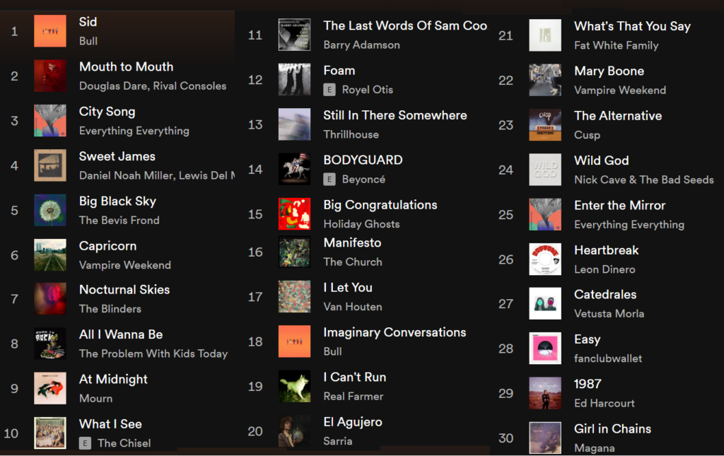 Además los nuevos singles de Airpark, American Culture, Anna Erhard, Anna Prior, Anna Tivel, A place to bury strangers, applied communications, Bernard Butler, Blaqk Van, Blondshell/Bully, Bnny, Bryde, Bullion, Cal Lynn, Cat Cork, Chalk, Clarendon, The Confusions, Courting, Crumb, Curses, Dear Vandal, DIIV, Drop Nineteens, Each Confide, Ella Ronen, FACS, faery, Fat White Family, Formal Sppeedwear, georgia georgia, gglum, Girl and Girl, Goodnight House, Habibi, Heland, Hot Joy, Hozier, Izzy Stone, Jack Gaby, Jessica Pratt, JONES, Julia Logan, Kaleida, LB Beistad, Lenny Kravitz, Leon Dinero, Lightning Bug, Lonely Gimmick, Lunde, Mantaray, Martha Rose,Marton Harvest, mary in the junkyard, Midnight Psychic, Milou Moon, Mirrorball, Nina Kinert, Parnsip, Pat Berlinquette, Pau Dill, Pearl Jam, Plum, R.Missing, Rose Hotel, Sam Akpro, Shannon & the Clams, Sofia Bolt, St.Vincent, Tanlines, T Bone Burnett, Tired Cossack, Trash Pals, Tuff Bear, Vampire Weekend, Void Vampires o Wallows. Y sonido nacional con Alavedra, Antonio Irún, Belize, caracazador, DEVALO, Els Llums de colors, For your information, from, La Otra, Malamute, mastodonte, Mediapunta, Morreo, Nudozurdo, Pony Bravo, Roger Padrós, Rojuu o Vetusta Morla.