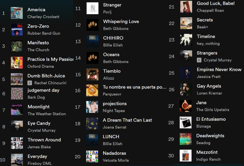 Y los nuevos singles de Abstract Crimewave, Arily Michel, Bay Ledges, Beatrix, binki, Carrie Stardust, The Chameleons, Chelsea Days, Cigarettes After Sex, Clairo, Closebye, Couer-Joie, Cola, Daze of Lour, Dean Blunt, Fred Aging…, FLEECE, The Girls Upstairs, Glass Animals, Haich Ber Na, Half Waif, hey nothing, IAN SWEET, Jamie XX, The Jesus Lizard, Kid Loco, Laughing, Liam Malcolm, Liana Flores, Lola Young, Loma, Lonely Richard, Maxim Ludwig/Angel Olsen, Mercury Rev, Muddy Monk, Nick Cave and the Bad Seeds, Nourished by time, Oceanator, Orville Peck/Kylie Minogue/Diplo, Parallel, Personal Trainer, Phantogram, Philinne Sonny/Miya Folick, Pillow Talk, Placid Cactus, Redd Kross,Sanford, Silver Jack, Soccer Mommy, Stanleys o THE THE, entre otros. Y sonido nacional con Alavedra, Algora, Alondra Bentley, Biznaga, Camellos, Carolina Durante, Jimena Amarillo, Joana Serrat, Kokoshka, Los Punsetes, Mujeres/SVPER, Pinpilipussies, Sen Senra, TAURO o Vetusta Morla.