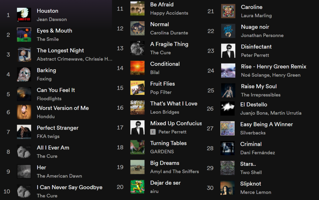 Y además los nuevos adelantos de Adrian Crowley, Alice Phoebe Lou, Anna B Savage, Annahstasia, BADBADNOTGOOD ft Tim Bernardes, Bartees Strange, The Black Keys/Beck, Calla, Cameron Sonnier, Caoilfhionn Rose, Chastity Bell, Chemtrails, colatura, Cold War Kids, Crystal Murray, Dani Gavanski, Doves, dust, FACS, FEET,Flight Attendant, Flying Lotus, Ford Chastain, Fort Romeau, Gardener, Glades, Good Looks, Great Grandpa, Heatworms, HONESTY, Honey Please, Inhaler, JJ Miller, Jonathan Personne, Joshua Idehen, JR JR, LDD Soundsystem, Lee Trent, Maribou State, Marvelle Oaks, Michael Kiwanuka, Mild Orange, Milk Calton Regatta, Miracle On Film, Mogwai, Moreish Idols, MOTO BANDIT, oca pine, Problem Patterns, Rigo Kamp, Romy, Roomtones, Rooskin, ruben dumars, Sade Adu, Sharon Van Etten,ultrasaturated, Vanity Vox, The Weeknd, Wishy, Wussy o Yuna. Y sonido nacional con Albert Freixas, Amaral, Amateur, Barry B, caracazador, Cariño, Carolina Durante, Casero, Chaqueta de Chandal, Dani Vega, Dorian, Erin Memento, Ibon Errazkin, Juárez, Judeline, Ku!, Las Dianas, Las Migas, Las Nenas, Las Petunias, Lisasinson, Nos Miran, Parquesvr, Pauline en la Playa, Pumuky, Sílvia Pérez Cruz, Vera Fauna o Wild Honey.