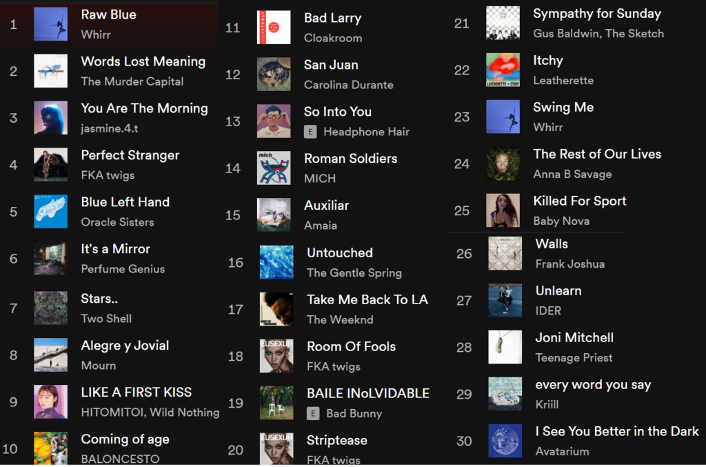 Y además los nuevos adelantos de Ada Oda, Afterpartees, Airhockey, Arny Magret, Baby Nova, Beck, Bellefolie, Black Country New Road, Blasé, Brigitte Call Me Baby, Buffet Lunch,CASTLEBEAT, Cheekface, The Clean, Communions, Conzemius, Courting, Craig Finn, Dana Gavanski, Daneshevskaya, Daniel Gum, The Delines, Devon Williams, The Dialtones, Disaster Kid, Drew Fiel, Dutch Interior, Edith Frost, Ethan Gold, Fake Plastic, Findlay, Fine China, Finnish Postcard, Floodlights, Franc Moody, Frank Joshua, Frog, Good Health Good Wealth, The Golden Dregs, Goose, Hamilton Hound, Hannah Cohen, Headphone High, High., Husbands, Infinity Knives, Intermission, JayWood/Tune-Yards, Jim Audet, J Mascis, Josh Rouse, JVLY, The Kerosene Hours, Kriill, Lackfelt, Leatherette, Lemon, Lord Huron, Lust for Youth, Mamalarky, Manic Street Preachers, The Men, Ménades, Mereba, MIEN, Miya Folick, The Murder Capital, Palace Winter, PARTICLS, Penelope Trappes, Pigs Pigs Pigs Pigs Pigs Pigs Pigs, Press Club, quickly quickly, RUBII, Runnner, Shapes like People, Shura, Sibling, Sophia Kennedy, Sophie Breton, Stock Photo, swim school, Tamino/Mitski, Time Behind, Total Fucking Darkness, Tunde Adebimpe, Twin Shadow, Viagra Boys, Wet, Winter TV, Y is nature, Yndling. Yvers Jarvis o Wryn. Y sonido nacional con Alba Reche, Algora, Amaia, ANIMADORA, arrecí0/El Ultimo Vecino, Biela, Carameloraro, Chucho, CRISTALINO, Duele, El Faro, Fermi/Maria Rodés, Gorka Urbizu, Grande Amore, Joe Crepúsculo, Morgan, Queralt Lahoz, Sanguijuelas del Guadiana, Tenda, te vi en un planetario, trashi, Vicente Calderón o Yawners.