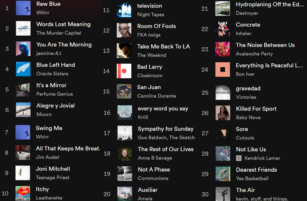 Además los nuevos adelantos de Ay Wing, BAMBARA, Beirut, The Bird Calls, Blessed Child Opera, Bob Mould, Bon Iver, Burton Badman, CAGEDANCR, Caleb Nichols,Caroline Spence, Chastity Belt, chest., Chris Makh, The Convenience, Corduroy Moon, Courtney Barnett, Daffo, Dead Gowns, Dean Wareham, Destroyer, Diggsy, Divorce, Dora Jar, Dorio, Doves, Dylan Cox, Edwyn Collins, Esther Rose, Ezra Furman, Fake Plastic, Flavor Wave, Freak Slug, Frog Eyes, Futureheaven, Georgia Harmer, GIVĒON, Gloria, GOLDICAT, GOMOJO, Go with Strangers, Hamilton Leithauser, Hello Midlands, HONEYMOAN, Jadu Heart, Jamcie, Jeansboy, Jelly Kelly, Kas Product, kevin.stuff.and things, Kite/Nina Persson, kitty ray, Korine, Lucius, Lucy Dacus, marias quest, Mark Pritchard/Thom Yorke, Maz, Mei Semones, Monte Crystal, Munan, Nell Smith, The Nightmares, ok ok, The Ophelias, Panda Bear, Peter Murphy, Petite League, Poni Hoax, Preoccupations, The Pretty Littles, Rachel Bobbitt, Sacred Paws, Sea Shapes, serpentwithfeet, snake eyes, snuggle, Steel Wool, Stranded Horses, Sura Laynes, The Sway, Teen Mortgage, Tash Sultana,Tennis, Tessa Rose Jackson, Throwing Muses, Tired Girl, The Tubs, Una Raye, Unknown Mortal Orchestra, Valerie June, The Vices, Vulfpeck, Waxahatchee, Winona Oak, YHWH Nailgun o Your Neibourghs. Y sonido nacional con Amaral, Atk Epoop, Blaumut, Bon Calso, Cómo vivir en el campo, Cupido, Gala i Ovidio, Hidrogenese, Joven Dolores, La Plata, Maria José Llergo, Mushkaa, Pálida Tez, Parquesvr, Pumuky, Repion, Rorro, roserona, shego, Suu, Tatuajes, TRISTÁN!, Vera Fauna, Vic Mirallas o Victorias.