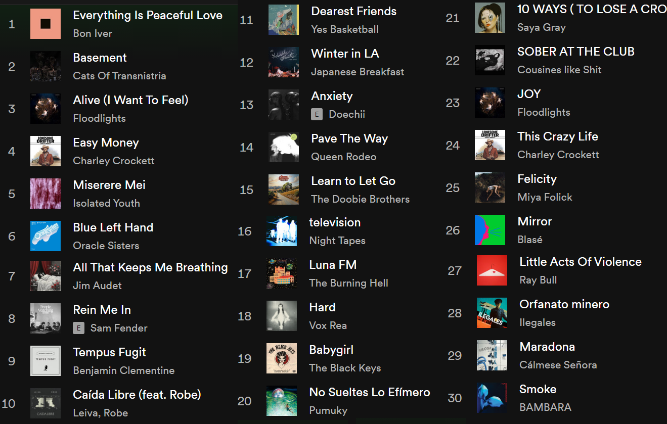 También adelantos de The 113, Absolute Losers, Alan Sparhawk, Alexandra Saviour, Alex Orange Drink, Annahstasia, Arooj Aftab, Art Longo, Beach Youth, Beast Beast, Beirut, Bibi Club, bifff, Bill Waters, Billy Nomates, The Black Keys, Black Country New Road, Bluhm, Bnny/Wild Pink, Bon Iver, Bouquet, Charlotte OC, Chancers, Chappel Roan, Charif Megarbane, CIVIC, Club 8, CMON CMON, Cola Boyy, The Convenience, Daughter of Swords, Debby Friday, Deerhoof, Deradoorian, Destroyer, Django Duyns, Dreamwave, Dylan Cartlidge, Ed Mount, Edwin Days, eggcorn, Eric Gabriel, Florence Road, Ford Chastain, Frànçois & The Atlas Mountains, French Nancy, Friedberg, Friend of a friend, ggwendoyn, Giorgio Poi, Gloria, Goldie Boutilier, GRMLN, half alive, The Hard Quartet, Hectorine, Index for Working Musik, Jawdropped, Jeremy Bradlay Earl, Joe Leytrick, JW Francis, L´objetif, Keren Ann, loucey, Love Spells, Luxury Communism, Mai Mai, Mamalarky, Marianne Faithful, Marika Hackman/Laura Marling, Marina Zispin, Mark Pritchard/Thom Yorke, Matt Berninger, Maz, Mazey Haze, Mei Simones, MF Tomlinson,Miki,Mynt, Moon Blue, Nell Smith, New Husband, Noah Cyrus/Fleet Foxes, The Ophelias, Paid by Cash, Parcels, Patrick Wolf, Phoneboy, Pike, Pom Femme, Postpostpurple, Preoccupations, Press Club, Pria, Rialto, R.Missing, Rodeo Boys, Rooskin/Beach The Tiger, Sally Saphiro, Sedona/Claud, soft siren, spill tab, Star99, Stepmother, Suzanne Vega, Tropical Fuck Storm, Tunde Adebimpe, Turning Birds, Ty Segall, Vansire, Vox Rea, Walter The Producer, Wet, Will Johnson, Wishy, Yasmine Hamdan. Y sonido nacional con Aló Presidente, Barry B, Bianca Steck, CANTEO!, Confeti de Odio, Delaossa, Ek Décimo Hombre, Ice Haven, Ilegales, Juanjo Bona, La Bien Querida, Living Camboya, Loquillo, María Rodés, MARIA HEIN, Niña Polaca, Patronato, Pequeño Mal, Pirámide, Repion/Tulsa, Rufus T.Firefly, unsalto o Valeria Castro.