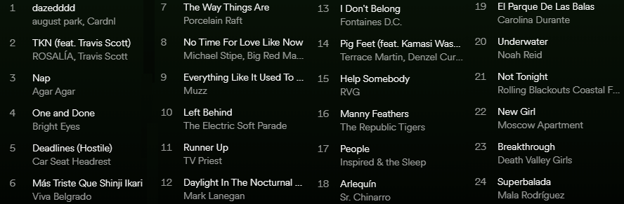 También los nuevos singles de Moscow Apartment, Riverby, Remington Super 60, Air Devi, Public Enemy, Kaedron Bryant, Beyoncé, A.Swayze & the Ghosts, Creeper, 0171, IDLES, Aaron Joseph Russo, Jess Chalker, Annie, Doves, Thurston Moore, Francis of Delirium, Caiti Baker, Tuesday Faust, The Rah´s, Bruce Hornsby feat James Mercer, Sun on Shade, Morningwhim, Shamir, Staplin, FAded Paper Figures, Sean O´Hagan, Tents, Juliana Barwick feat Jónsi, The Fiery Furnaces, MOY, Loud Hound, Pure Bathing Culture, Andrew Vine, Repairs, HOOPS, Keleketla! feat Coldcut o Tom Roshental, entre otros. Sin olvidar sonido nacional con La Trinidad, Flamaradas, Llum, Nightcars, Odina, Paranormales, Chucho, Bueno, Cómo vivir en el campo, Calavera, Betacam o Alberto & García.