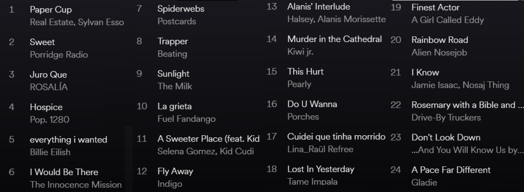 y los singles de CIEL, Sego, The Psichedelic Furs, Gorillaz, Michael Stipe, Braids, Jordan Mackcampa, Andi Fins, Marti West, Chastity Belt, Noel Gallagher´s High flying birds, Ultracrush, Kyle Forester, Rustin Man, Lucky Daye para la BSO de la película The Photograph, Futuro Pelo, Malena Zavala, The Men,Little Dragon, Sébastien Tellier, Seazoo, Genghar, Hazel English, Greg Dulli, Eve Owen,Didirri, The Belafontes, I Break Horses, Caribou, Victor Solf, Basia Bulat o Favor, entre otros. Además sonido nacional como el de Niños Mutantes, Single, Jorra i Gomorra, Maria José Llergo, Triángulo de Amor Bizarro, C.Tangana, Hinds, Trépat, IZARO o The New Raemon.