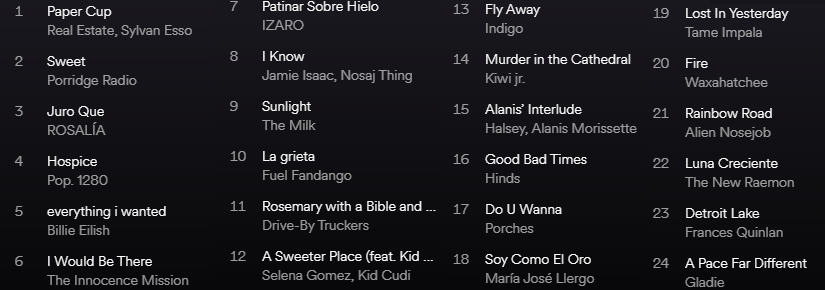 También los nuevos singles de cabane, Lucinda Williams, Warm Digits & Emma Pollock, The Strokes, Jerskin Fendrix, Caelin, Sharon Van Etten, Sam Nichol, Rolling Blackouts Coastal Fevers, Jason Isbell & the 400 Unit, Disq, Lucas Santtana, Man of Moon, Mantaray, Moses Sumney, Bikini Body, Nadia Reid, Native Sun, Kazy Lambist, Joseph Lawrence and the Garden, Chancellor Dean, Pet Shimmers, U.S.Girls, Post Animal, The Radio Dept, Harkin, Val Son, Hamilton Leithauser, Velvet Volume, Claude, Caroline Blind o Addy, entre otros.
