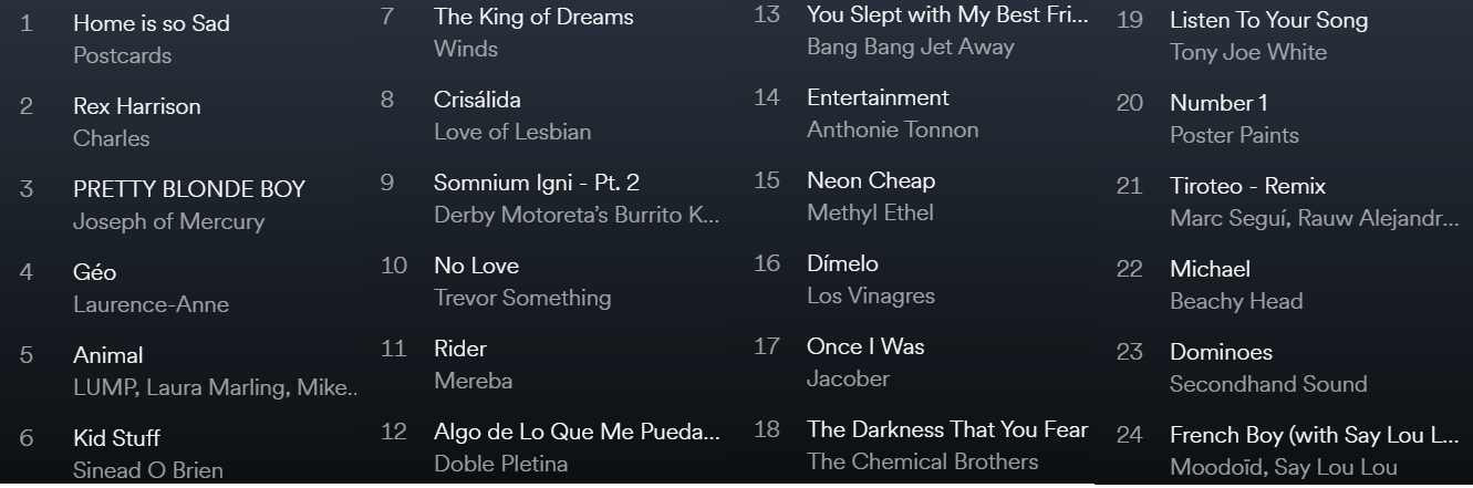 Además los nuevos singles de Secondhand Sound, Okkervil River, Shire T, Freddie Dickson, Poster Paints, Tigercub, Max Bloom, The Go! Team, Women of the night, She drew the gun, boypablo, Charlie Dudda, Common Grackle, Cumbie, Jaws the Shark, Spelling, The MOuntain Goats, Holiday Ghosts, WhomadeWho, Resynator with Matt Berninger, Country Westerns, Dead Ghosts, Wild Pink, Dan Croll, Quivers, TORRES, Islands, Beharie Laura Mvula, HIldegar, The Goon Sax, Erika de Casier, Margo Price, Jill Wit, Izzy True, Massage, HEALTH/Nine Inch Nails, Liars, Rodrigo Amarante, Little Simz, Bobby Gillespie & Jenny Beth, Ali Awan, Parcs N Rec, Clear Coast, Dayglow, Tora, Tuvaband, Deep Talk, Clio, Cathal Murphy, Saint Nomad, Someone, Girl Time o Bnny, entre otros. Y sonido nacional con Baiuca, Marc Seguí, Lori Meyers, Adios Amores, Mecánico, Escuelas Pías, Lezón & Limousin, La Plata, Cabiria, Tigre y Diamante, Rio Arga o Viuda.