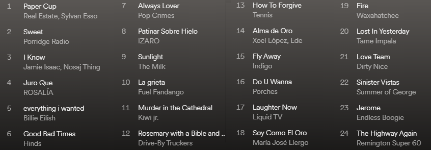 Además, los nuevos singles de Dirty Nice, The Avalanches, Arches of Loaf, Field Division,Aaron Joseph Russo, Moaning, Why Bonnie, Pizzagirl, The Strokes, Empty Country, Yves Tumor, Talk Show, Chrysalism, Forever Honey, Land of Talk, Modern Studies, Alanis Morrisette, Feng Suave, The Gloomies,Yumi Zouma, Sufjan Stevens, A.Swayze & The Ghosts, Wisemind,Andrew Weatherall, Amos The Kid, Chemtrails, Bilal, RVG, Real Estate, Methyl Ethel, Pearl Jam, The Rentals o Soccer Mommy, entre otros. Además, sonido nacional como Jero Romero, Melenas, Los Enemigos, El Columpio Asesino, The New Raemon, Detergente Líquido,Soledad Vélez, Bunbury, Blaumut o Xoel López, entre otros.