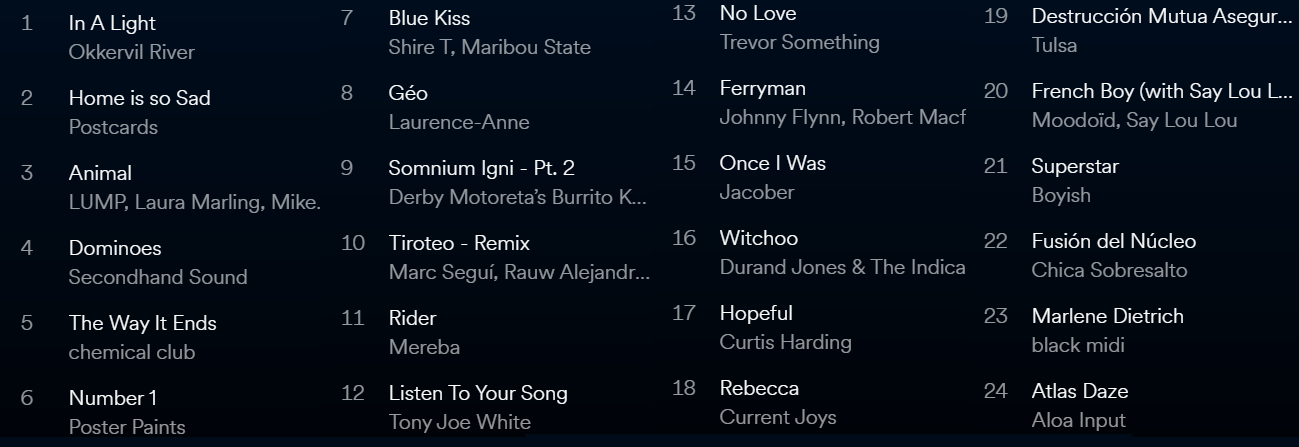 Además los nuevos singles de Ampersounds ft Rufus Wainwright, Cape Weather, Caroline Lucius, Causeway Youth, CHVRCHES & Robert Smith, CLOUDLAND, DARKSIDE, Doug Tuttle, Veps, Vacation Forever, Gionatan Scali, TOKIMONSTA, The Tin Can Collective, Turner Cody, Timid The Brave, They Might Be Giants, Ten Hands High, Teenage Sequence, Tamlin, Spelling, Sparks feat Adam Drive & Marion Cotillard, skirts, SIPHO., Sennen, Scott Hirsch, Remi Wolf, poolfire, Peter von Poehl, Nik Brinkman, Nicolas Godin, The Mountain Goats, Hiss Golden Messenger, Hobo Johnson, INA IVY, IRJA, Jungle, Kenneth Whalum, Kevin Holiday, Kings of Convenience, Lightning Bug o LUMP. Y sonido nacional con Bueno, Carlota, Carolina Durante, Depresión Sonora, Detergente Líquido, Doble Pletina, Emilia,Pardo y Bazán, Wild Honey, Ronroneo, Ramírez Exposure, La Plata, Maronda y Medalla.