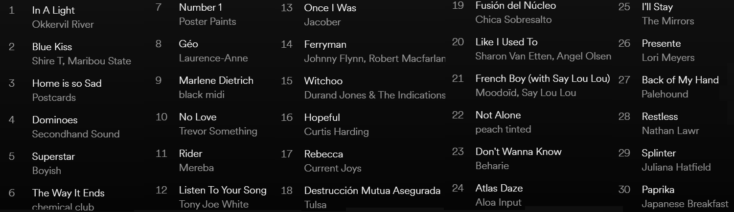 Además los nuevos singles de The Shop Window, Tinashe, Sungaze, The Mirrors, Deafheaven, Anika, Central Heat Exchange, Silver Firs, Choir Boy, Delivery, Anne Freeman, The Boy Least Likely to, Dave McMurray/Bettye Lavette/Bob Weir, Durand Jones & The Indications, Hypnotic Brass Ensemble & Perfume Genius, Kekko, Lunar Vacation, Mercury Slim, Me Rex, Odonis Odonis, The Rare Occasions, serpentwithfeet, Ryal o Unknown Caller. Y sonido nacional con Rio Arga, Nadie Patín, Biela, Cuello, dani, Ferla Mergia, La Habitación Roja, Lea Leone o Niña Polaca/Ginebras.