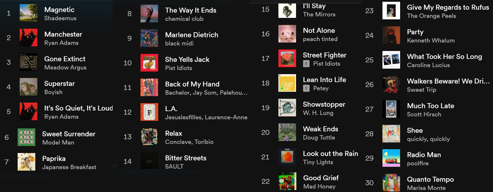 Además los nuevos singles de Alex Orange Drink, april june, Arjuna Oakes, Atmosphere, Austin White, Beige Banquet, The Belair Lips Bombs, Bermuda Bay, Blu Anxiety, Born without bones, Burkini Beach, Caroline Polachek, CMAT, Cuticles, Dad Hat, Dead Nature, Dumb, Eddie Skuller, Edward Randall, Els Michels Affair feat Liam Bailey, French for Rabbits, Gamma Intel, Gang of Youths, Gavin Turek, Girl K, Glassio, Gregory Abbott, H!, Haim, Harry Heart, Heartly Bastards, Home Enterntainment, Hovvdy, Isabella Rosetta, Isolation Berlin, JW Francis, Kate Toupin, Lala Lala, Lemonade Baby, Little Hag, Lone, Young & Sick, Warm Drag, Wallice, Volunteer Department, Valley Price, Tim Atlas, Teenage Priest, Syd, Sweet Teeth, Stello, Speelburg, Solo Career, Skydeck, Secondhand Sound, Roxy Girls, Room Thirteen, quickly,quickly, Proc Fiskal, Princess Century, Pop.1280, Pixey, Pip Bloom, Peter Hall, Oslo Twins, OMB Bloodbath, Omar S, Old Moon, Ola Village, Olamide, No Vacation, No thee no ess, Non-Funkible,NHHMN, Magnetic Heads, Mega Bog, Meggie Lennon, Mewn, Midlife, Myriam Solomon, Moonlight Breakfast, MorMor o Nate Smith. Y sonido nacional con Biela, Bernarda, Corizonas, Cuchillas, El Petit del Cal Eril, Julio de la Rosa, Leia Destruye, Los Vinagres, Vetusta Morla, Santa Companha, Pixel de Stael, Maria Sarmiento o Maria Guadaña.