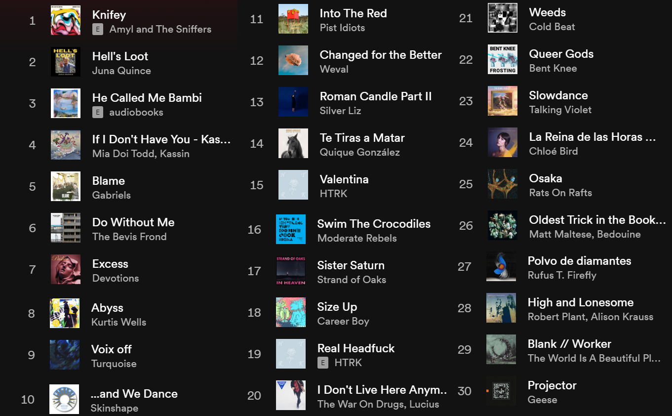 También los nuevos singles de Abbrevations, Alien Nosejob, AM Higgins, Band of Horses, Barrie, Baxter Dury, Benz, Big Thief, Black Country New Road, Cat Le Bon, Cat Power, Claire Cronin, Clean Hands, Coco, Colatura, Courtney Barnette, Damon Albarn, DARTZ, Dim Wizard, doppelfinger, Egyptian Blue, Elizabeth Hart/Hope Sandoval, Elison, Ferdous, Francis of Delirium, FLETCHER, Furrows, Generationals, Gimme Flowens, The Gluts, Good Dog, Hamilton Leithauser/Kevin Morby, Humble Braggers, Imarhan, Jane., Japanese Heart Software, The Jazz Butcher, Jeff Tweedy, Jude Shuma, King Garbage, The Kundalini Genie, Laetitita Saedier, Makthaverskan, Marisa Nadler, Michael Alan Scott, Michael Kiwanuka, OK Cowgirl, Old man in the Woods, Plastic Mermaids, Robert Plant & Alison Krauss, Rats on Rafts, REYA, Royel Otis, Sad Madona, Sam Evian, Semi Trucks, Snail Mail, Tears for Fears, Tiny Little Houses, Tory Amos o Safety Town, entre otros. Y sonido nacional con Amaya, Amor Líquido, Angel Calvo, Apartamentos Acapulco, aroa ay, Blanco Palamera, Bonitx, Cabezazo, Chico Jorge, Colectivo da Silva, Cosmen, Delaossa, Marc Meliá, Morreo, Parade, Quique González, Rels B, Sen Senra, TAURO, Toundra, Viaje a Sidney o Violeta.
