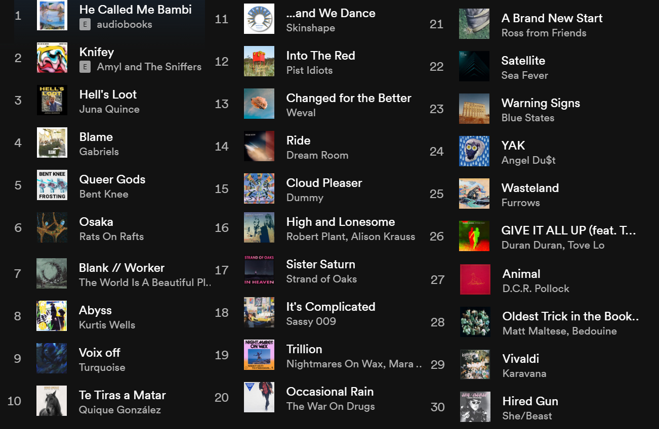 Además los nuevos singles de 40 Watt Sun, AGATH CHRIST, Aimee Mann, Air Devi, Ajak Kwai, Alex Lahey, Alice Ivy, Alligatorz, All We Are, Alpen Grow, Ancient Cat Society, Andrea Chahayed, Animal Collective, Beach Bunny, Beirut, Ben Special, Benz, Bezos, Big Kill, Blue States, BLYNE, Cannons, Chime School, Clare Kelly, Club Soccer, Distant Lovers, Dream Room, Dzasko, Eels, Farves, Felines, Findlay, Forever Honey, Foyer Red, Frank Turner, Freedom Fry, Glass Animals, Glom, Gulfer, Habibi, HalfNoise, Hana Vu, HEALTH, Home Counties, Hot Dad, Ibibio Sound Machine, Jack White, Jess Chalker, Jordan Klassen, Kids Return, Lady Wray, Laura Wolf, Lazy Days, Lena Mindler, Le Pain, Liance, Lili Joy,Mauvais œil, Mazey Haze, Mediocre, MICHELLE, Midlake, Mild Minds, Mild Orange, Mild Universe, Morning Silk, Nation of Language, NICOLAS, Obongjayar, Orion Sun, O´Sullivan, Ovlov, Real Estate, Roller Derby, Rome is not a town, Same Eyes, SASAMI, Sea Wolf, Snail Mail, Tape Tension, Tim Heidecker, Tom Jones, Tops, Toria Wooff, Vlad Holiday, Warm Human, White Bike, World Brain,Zinskē