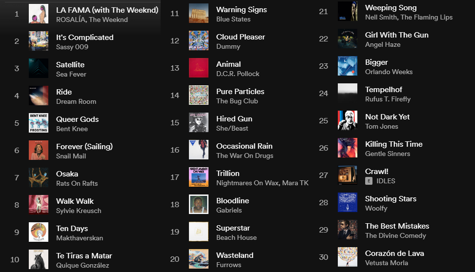 Y los nuevos singles de Aeon Station, The After Hours, Alewya, Anonymous Depressed Dogs Club, Ben Straw, Big Softy, Big Thief, Bloc Party, Blush, BLYNE, Brandon Michael, Cate le Bon, Chace Saltman, Colatura, Coupdekat, Dead Modern, Desert Liminal, Director´s Vision, The Divine Comedy, Eels, Federico Albanese/Marika Hackman, FERLA, Fieh, FKA twigs, Fleur Electra, Gentle Sinners– proyecto paralelo del vocalista de la formación escocesa The Twilight Sad– Gwendoline, Heather Nation, Home Front, Hooper Crescent, Horace, Ibeyi, Jaakko Eino Kalevi, James Sullivan, Jane., Jesse D´Cora, Kaputt, Kavinsky, KAYTRANADA, KEG, King Hanna, King of Nowhere, Langva, Loop– veterana banda británica que trabaja en su primer álbum en 30 años- Lime Garden, Lucky Lo, Lunarette, Madeline Kenney, Magon, Makeout Point, Martin Carr, Men In Love, Naima Block, Nonfiction, Orlando Weeks, Otik, Phil Madeley, Phil Millett, Plastic Estate, RAYVENTURAS, *repeat repeat, Robert Sotelo, Saint 44, Saint Etienne, Sakkaris, Sam Akpro, Silklake, Sipper, Slark Moan, The Soundcarries, Sunflowers Thieves, sweethearts, Synapson, Tahiti 80, Talmont, Tennyson, Thyla, Veronica Everheart, William Doyle o Yot Club, entre otros.
