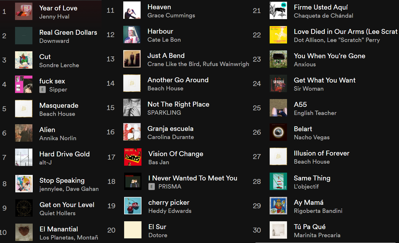 Además los nuevos singles de Arlo Parks, ASHRR, Beach Vacation, Benee, Boulevards, Caroline Spence/Matt Berninger, Dana Gavanski, The Districts, Dot Allison/Lee «Scratch» Perry, Emily Jane White, Flume/May-a, a fungus, Future West, Gloria, Half Dream, Heddy Edwards, Horace Andy, Kavinksky,Kamasi Washington, Kuya Moises, Le Big Zero, Letting Up Despite Great Faults, Liam Gallagher, L´Objetif, Lucy Dacus, Mallrat, Melt Motif, Modern Studies, Morning Silk, Mousey, Mylar, New German Cinema, Obongjayar,Paolo Ruiu, Paul Weinfield, Pet Deaths, Placid Cactus, Queen Naija, Rachael Jean Harris, Red Hot Chili peppers, Rolling Blackout Coastal Fever, Royal Arch, Röyksopp ft Alison Goldfrapp, Sea Glass, Sharon Van Etten, Silver Lining, Sir Woman, Stephen´s shore, TOVI, Willow Avalon o Shakey Graves. Y sonido nacional con Anabel Lee, Cora Yako, El Ultimo Vecino, Finde Fantasma, Ginestà, Juárez, Magia Bruta, Marlena, Meerna, Miss Caffeina,O’Cristo, Pantocrator o Salvatge Cor.