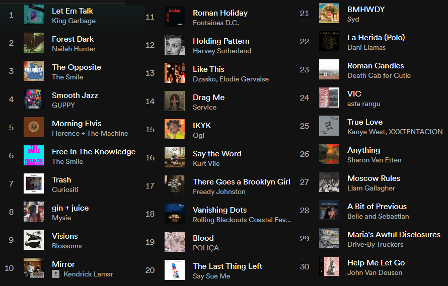 Además los nuevos singles de Kanye West/XXXTentacion, The Haunted Youth, Belle & Sebastian, Tamino, Blondshell, Ghost Woman, Royel Otis, Air Waves, Pastis, Carlina, Oliver Sim/Jimmy Sommerville, Sincere Ingeneer, ooi, The Youth Play, Bathe Alone, Jungle, Bad Pelicans, chemical club, Flasher, Damien Jurado, Gillies, Flipturn, Morabeza Tobacco, Lava LaRue, L´objetif, NoSo, Valentino Vivace, Phoenix, The Mountain Goats, Native Sun, Pine Barons, Nick Tape, Queen of Janes, SASAMI/J Mascis, Suede, Tim Heidecker/Kurt Vile, Will Butler o Yeah Yeah Yeah/Perfume Genius, entre otros. Y sonido nacional con BANANI, Airbag/J, Algo, Los Estanques/Anni B Sweet, Julio Bustamante, Manolo García, La URSS, Los Mejillones Tigre, Malamute o Rocío Márquez/BRONQUIO.