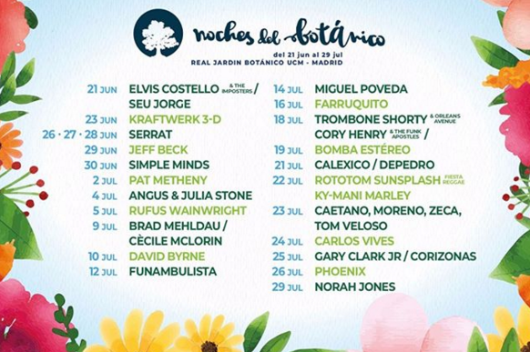 El Real Jardín Botánico de la Universidad Complutense de Madrid se celebrará del 21 de junio al 29 de julio y en su cartel ya cuenta con la confirmación de Norah Jones, Elvis Costello, Joan Manuel Serrat, Jeff Beck, Pat Metheny, Kraftwerk, David Byrne, Calexico y Caetano Veloso, entre otros.