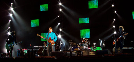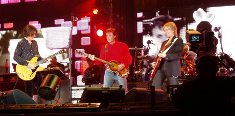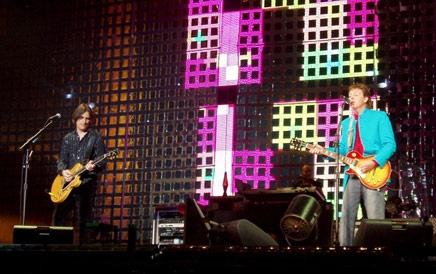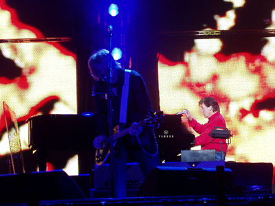 A lo largo de las canciones de los Beatles volvió a emplear el recurso de la nostalgia, mostrando en las pantallas gigantes (cuatro a cada lado del escenario y casi el doble en el fondo del escenario) diferentes imágenes en blanco y negro del grupo que formó junto a John Lennon, George Harrison y Ringo Starr. También fue introduciendo poco a poco a los músicos que le acompañan desde su anterior gira: Rusty Anderson a la guitarra (con su chiste “sólo sé estas palabras de español”, sin añadir nada más), Brian Ray al bajo y la guitarra dependiendo del instrumento que tocara Macca en ese momento (y que felicitó al “novio y la novia” en alusión a la boda del Príncipe), Abe Laboriel a la batería (que en un perfecto español con acento mejicano presentó el Live and let die con la exaltada pregunta “¿están listos para el fuego?”) y a Wix Wickens al piano y los teclados.