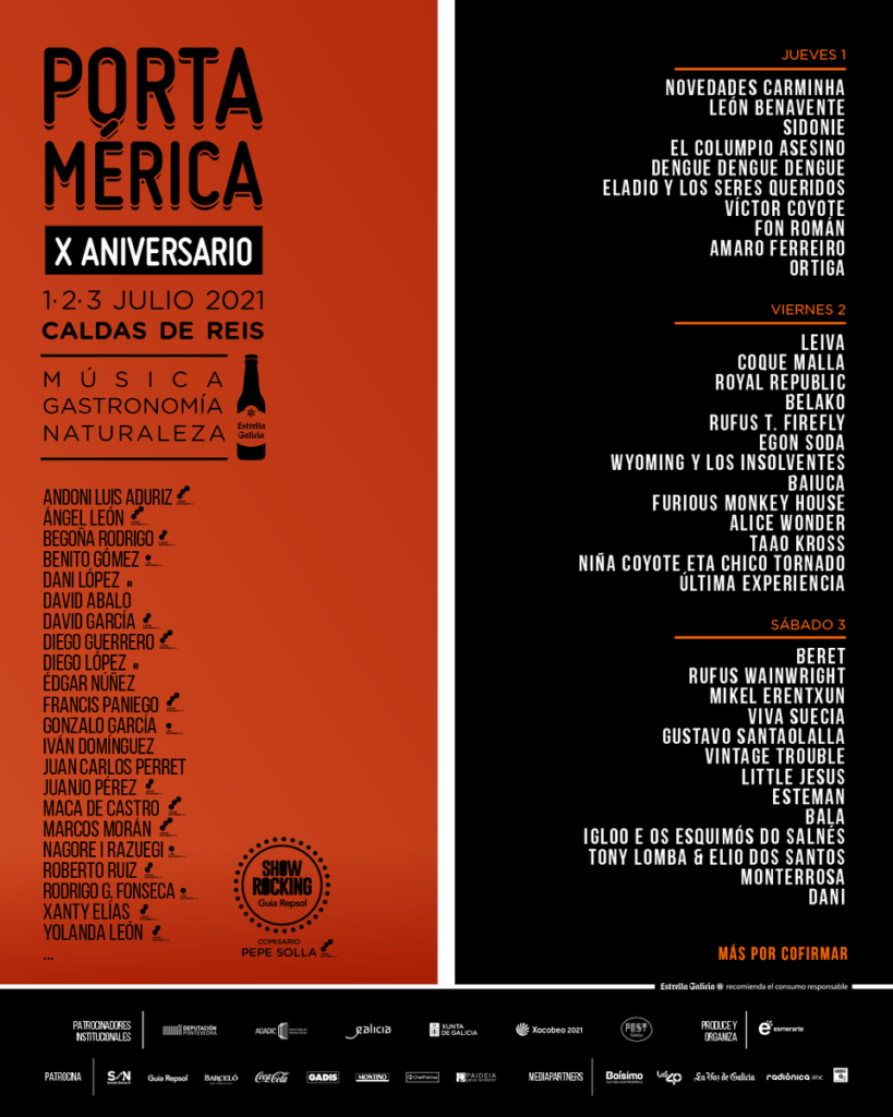 La Carballeira de Caldas volverá a inundarse de música y la mejor gastronomía el próximo verano. La décima edición del festival Portamérica tendrá lugar en Caldas de Reis del 1 al 3 de julio de 2021, un año más tarde de lo esperado debido a la crisis generada por COVID-19. También mantienen el evento gastronómico Showrocking Guía Repsol, para el que ya se han confirmado 34 Soles Guía Repsol, una propuesta para promocionar productos locales con la ayuda de los mejores chefs gallegos. Las personas que tienen billetes para la edición de Portamérica 2020 pueden usarlos para 2021.