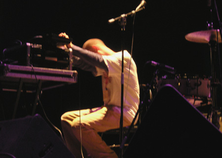 Con media hora de retraso saltó al escenario de la sala Mac en el Mercat de les Flors, a la hora del café, el que fuera líder de Third Eye Foundation. El de Bristol se acompañó de un único subalterno que igual tocaba el violonchelo que usaba una mesa de mezclas. A priori esta austeridad tenía que haber supuesto un fracaso mayúsculo cuando el único disco de Elliot en solitario, The mess we made (Domino, 2003) se basa en un acompañamiento orquestal digno del mismísimo Sakamoto. Sin embargo, lo que no reparó en músicos se reveló en electrónica. Así, Elliot recurrió al sampleo continuo y en directo de prácticamente todos sus instrumentos. Es difícil de explicar, pero imaginemos el tema Forty days donde pueden escucharse tres guitarras distintas, órganos y coros. Matt va construyendo la canción tocando una guitarra, la graba y reproduce la misma mientras toca la siguiente guitarra, vuelve a samplear y a reproducirlo para meter la tercera guitarra, y así con cada uno de los instrumentos que escuchamos en la canción, un trabajo sólo a la altura de los mejores artesanos. Si encima nos encontramos en una sala totalmente a oscuras, su disco, de lo más aterrador del año pasado, se convierte en pura magia.