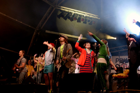 Buen reclamo publicitario, pues su tema homónimo fue una digna banda sonora para el anuncio del festival, y también por su actitud. Es cierto que lo mismo que hacen estos 28 suecos lo podrían hacer 5 o 6, pero seguro que no sería tan sumamente divertido. Es más, a nivel musical no aportan nada: actuación de coros imposibles, trompetas, guitarras, batería, claves, maracas, teclados… Nada que no estuviera ya visto, pero el resultado fue un set en el que el pop era el hilo conductor del buen rollo. Desde los tiempos de Travis nadie salía de un escenario con esa tonta sonrisa de felicidad que el jueves se nos dibujó con I’m from Barcelona, pero también con Oversleeping, Treehouse, Rec & play o Collection of stamps. Triunfaron porque, gracias a Dios, todavía el pop puede ser divertido. Jorge García