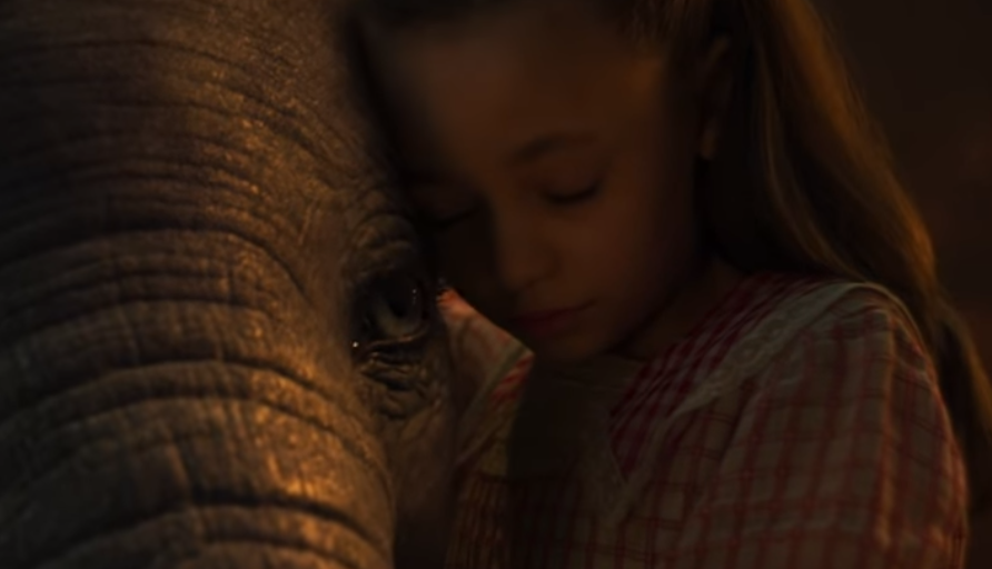 El trailer está protagoizado por la artista noruega Aurora cantando Baby Mine. Burton la eligió personalmente para participar en la película. Una sinopsis oficial de la película dice: «El nuevo largometraje de acción en vivo de Disney, Dumbo, presenta a Holt Farrier (Farrell), una ex estrella de circo que encuentra su vida al revés cuando regresa de la guerra. El dueño del circo, Max Medici (DeVito), recluta a Holt para cuidar a un elefante recién nacido cuyas enormes orejas lo convierten en el hazmerreír de un circo. Pero cuando los niños de Holt descubren que Dumbo puede volar, el emprendedor persuasivo V.A. Vandevere (Keaton) y un artista aéreo llamado Colette Marchant (Green) hacen todo lo posible para hacer del peculiar paquidermo una estrella».