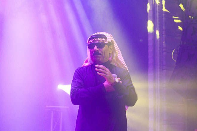 A Omar Souleyman no le hizo falta salir disfrazado ante el público para llamar la atención, su thawb (o túnica) conjuntado con sus gafas tintadas y su bigote poblado formaban parte de su atuendo habitual. James Pants y Joe Crepúsculo se ocuparon de calentar el Teatro Kapital antes de la actuación del sirio, la más esperada de la noche del jueves. El ambiente festivo se vio correspondido con los múltiples ritmos árabes que el teclista Rizan Sa’id acompañó con trompetas digitales. Omar cantaba, pero sobre todo animaba. Con razón al día siguiente algunos notamos agujetas, nuestras caderas se movieron instintivamente de una manera que pocas veces habían hecho antes en una sala de esas características. El respeto riguroso por cumplir los horarios nos restaron la media hora de más de concierto que muchos hubiésemos deseado para terminar de enmarcar la noche. Si llego a pagar los 15€ de la entrada en taquilla me habría sentido un poco decepcionado. Antes de las 12 estábamos todos en la calle viendo cómo los «niños bien» nos daban el relevo para que Kapital volviese a su aspecto original.