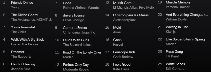 , Michael Beach, Cassandra Jenkins, Jordan Mackampa, Vilde, Brisa Roché, Alisa Tully, Weezer, Django Django, Madeline Kenney, Jeff Dazey, Real Numbers, Talkboy, International Music, Madblib, The Staves, Beach for Tiger, Adult Mom, Ohtis & Stef Chura, Mackintosh, Rone & Georgia, The Obseasives, Billy Nomates o The Crayon Set, entre otros. Y sonido nacional con Las Dianas, El Último Vecino, No sé a quién matar, Nueve Desconocidos, Califato 3/4, Los Hermanos Cubero, Carolina Durante, C.Tangana o Alexanderplatz, que estará mañana en nuestra sección el Test de las 5.