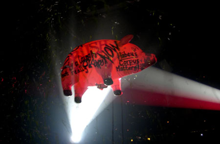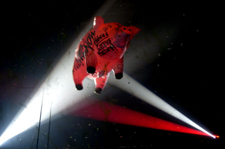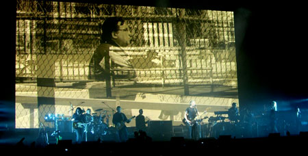 Waters también dedicó su tiempo al denostado The final cut (Columbia, 1983) con Southampton dock y The Fletcher Memorial Home (ésta última especialmente intensa) y a composiciones en solitario como fueron Perfect sense part 1 & 2 y la recién parida Leaving Beirut (una pieza que podría cantar Bob Dylan y que contiene fuertes ataques a Bush y Blair). Aquí se nos iba mostrando en la pantalla la letra de la canción a través de un curioso cómic. Para finiquitar esta primera parte, un gigantesco cerdo sobrevoló el Palau Sant Jordi mientras Sheep sonaba atronadora. De lo más punk de la noche. Entonces Waters anunció que volverían en quince minutos para ofrecernos el The dark side of the moon. La luna se iba acercando…
