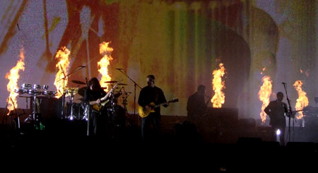 Deseábamos con impaciencia que llegaran las nueve y media de la noche. En la espera, y una vez ya dentro del Palau, pudimos observar detenidamente la gran pantalla (custodiada por dos más pequeñas a los lados) ocupada por la imagen de una radio antigua. De vez en cuando aparecía una mano para cambiar de emisora, ofreciendo principalmente pildorazos del mejor rock’n’roll clásico (Abba no duró ni dos segundos «en antena»). También hacía acto de presencia para agarrar el whisky mientras el humo de lo que fuera que se estaba fumando inundaba el paisaje.
