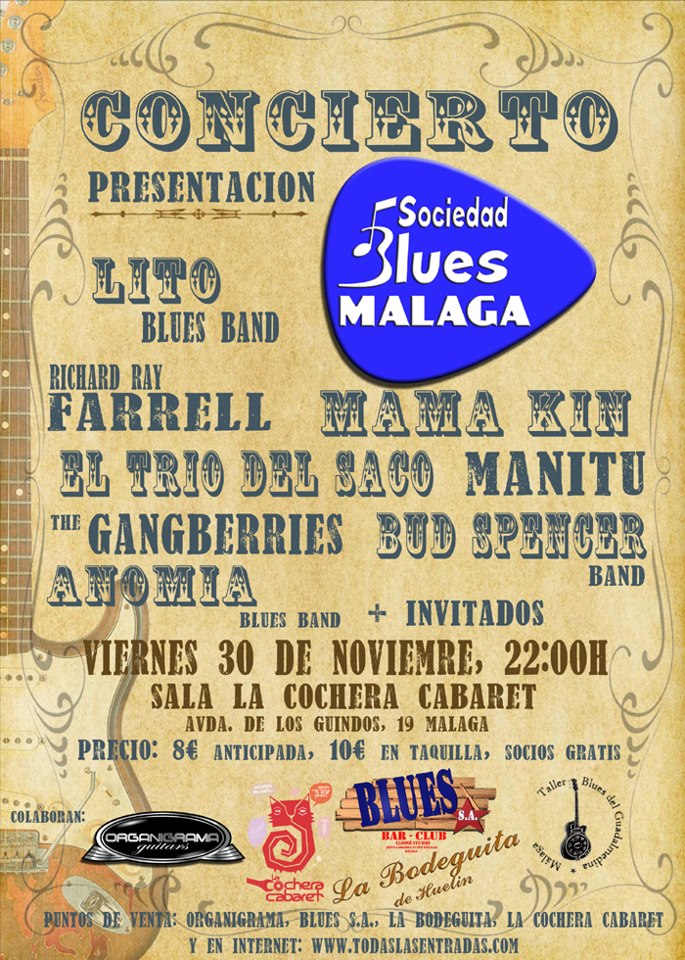 El 30 de noviembre se presenta la nueva Sociedad de Blues de Málaga, una asociación cultural sin animo de lucro que pretende la unión de todos los amantes del blues de esta ciudad, así como la divulgación y conocimiento de este estilo musical. Será en La Cochera Cabaret (Avenida Los Guindos, 19), a partir de las 22.00 h y con un precio de 8 € (10 € en taquilla).